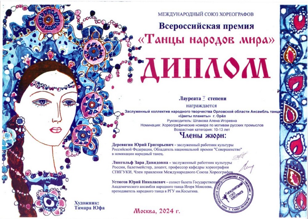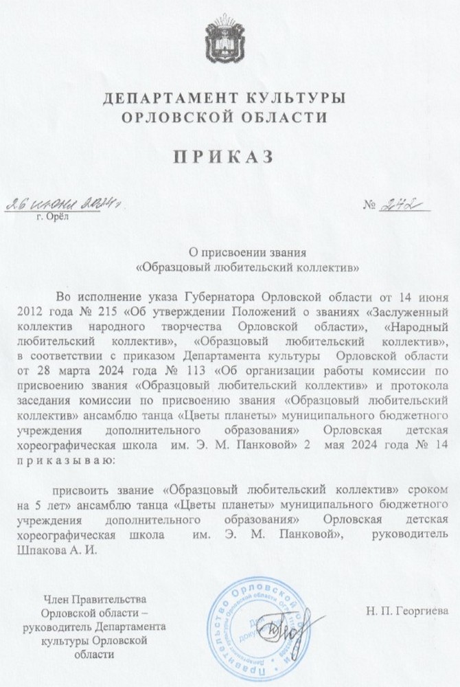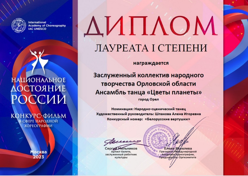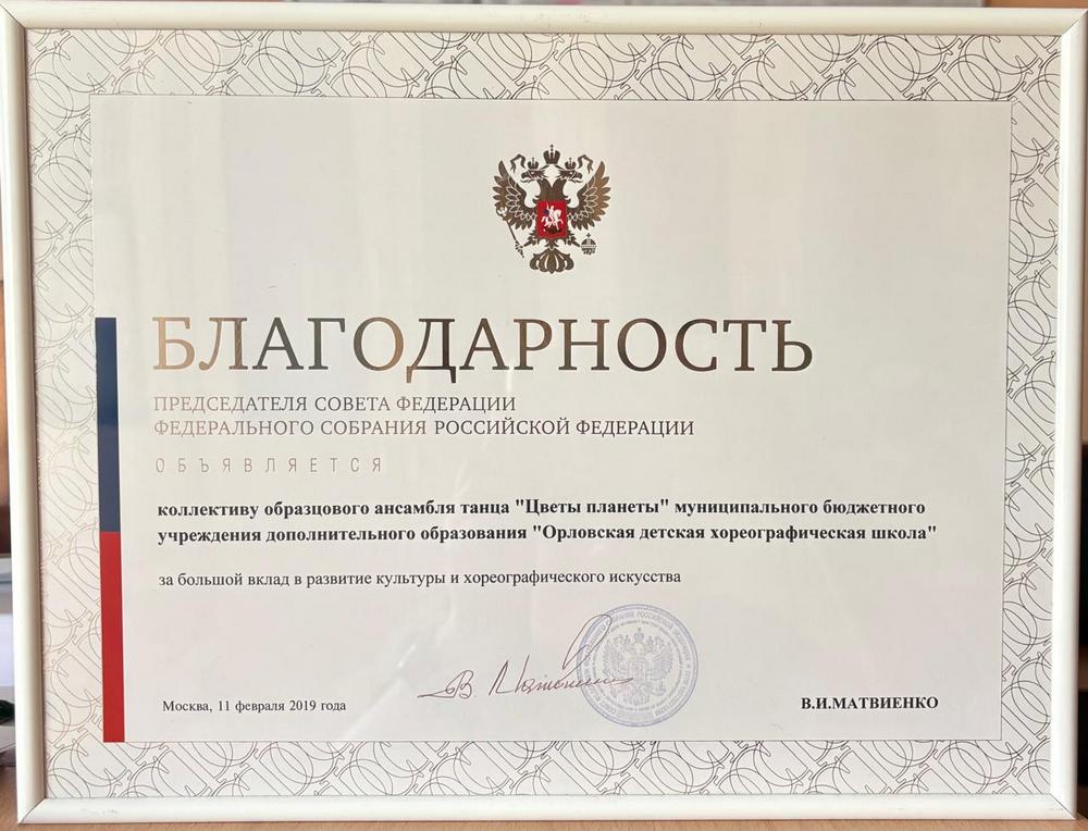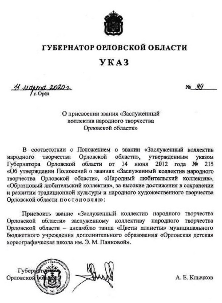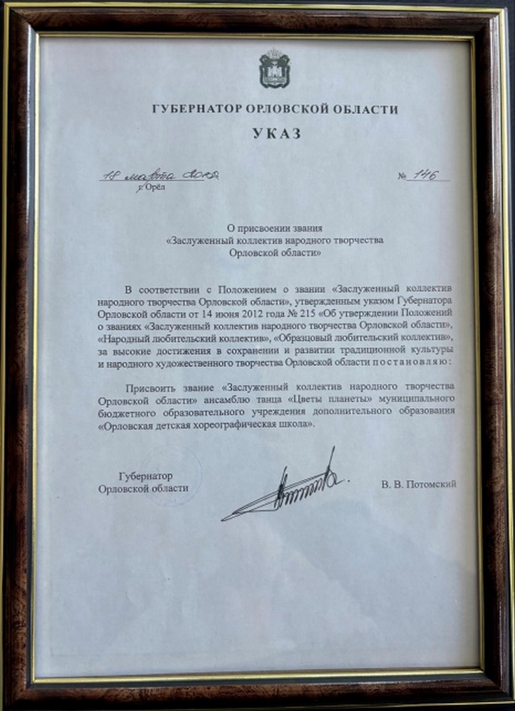 Указом Губернатора Орловской области от 18 марта 2015 года № 146 впервые присвоено звание «Заслуженный коллектив народного творчества Орловской области» ансамблю танца «Цветы Планеты» муниципального бюджетного учреждения дополнительного образования «Орловская детская хореографическая школа». В марте 2020 года ансамбль «Цветы планеты» повторно подтвердил это звание, а в июле 2025 года коллектив в третий раз удостоен почетного звания «Заслуженный коллектив народного творчества Орловской области».