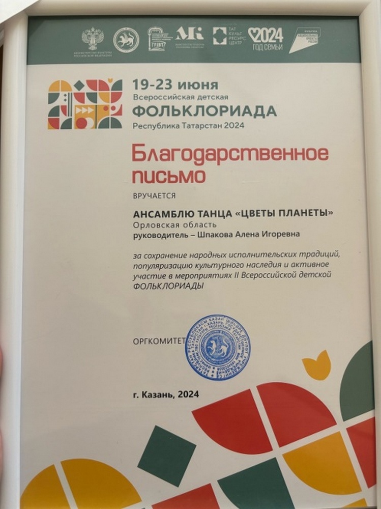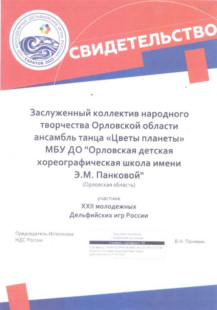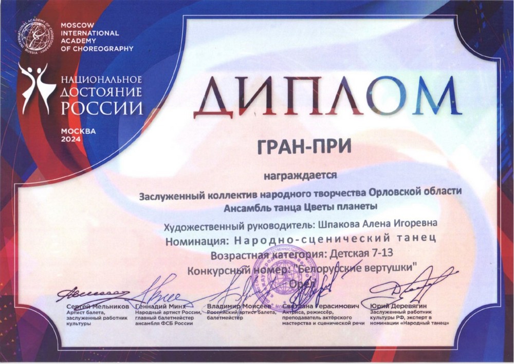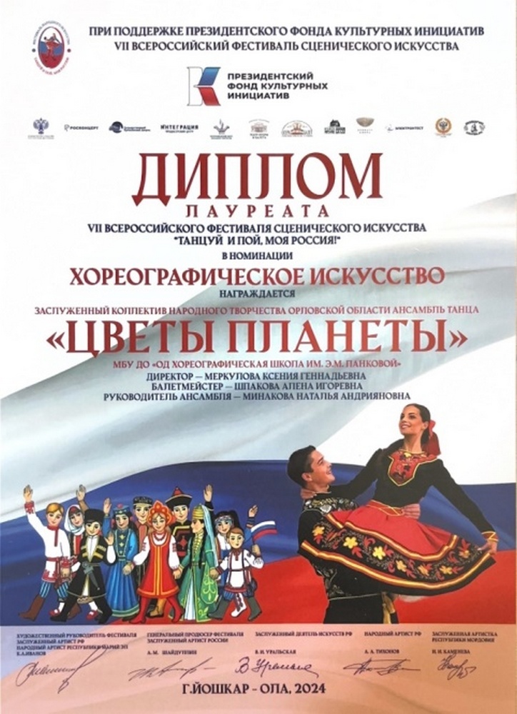 Ансамбль танца «Цветы планеты» муниципального бюджетного учреждения дополнительного образования «Орловская детская хореографическая школа им. Э.М. Панковой» - детский коллектив, который, выступая на мероприятиях разного ранга, показывает стабильный высокий уровень танцевального мастерства, достойно представляет честь региона на Всероссийских и Международных конкурсах - фестивалях детского творчества России и стран Ближнего и Дальнего зарубежья.