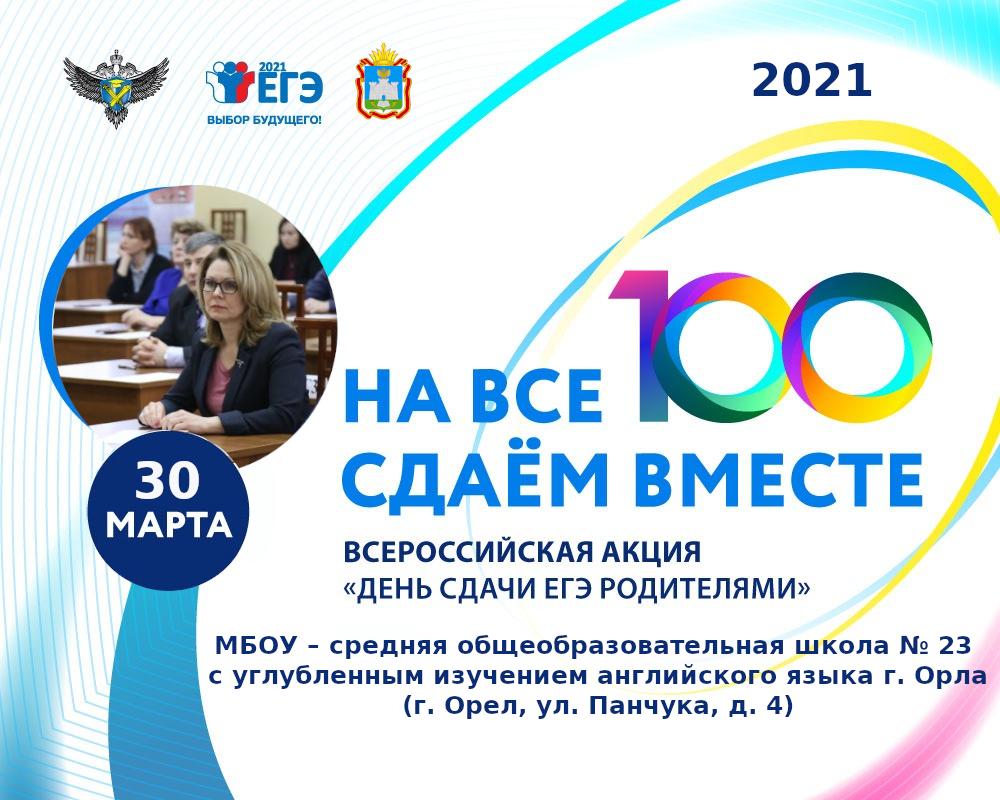 В Орловской области Всероссийская акция «Единый день сдачи ЕГЭ родителями» пройдет 30 марта 2021 года в 15:00 по адресу: 302001, г. Орел, ул. Панчука, д. 4, муниципальное бюджетное общеобразовательное учреждение – средняя общеобразовательная школа № 23 с углубленным изучением английского языка г. Орла. Акция призвана помочь выпускникам, их родителям и педагогам снять напряжение, связанное с подготовкой к ЕГЭ.