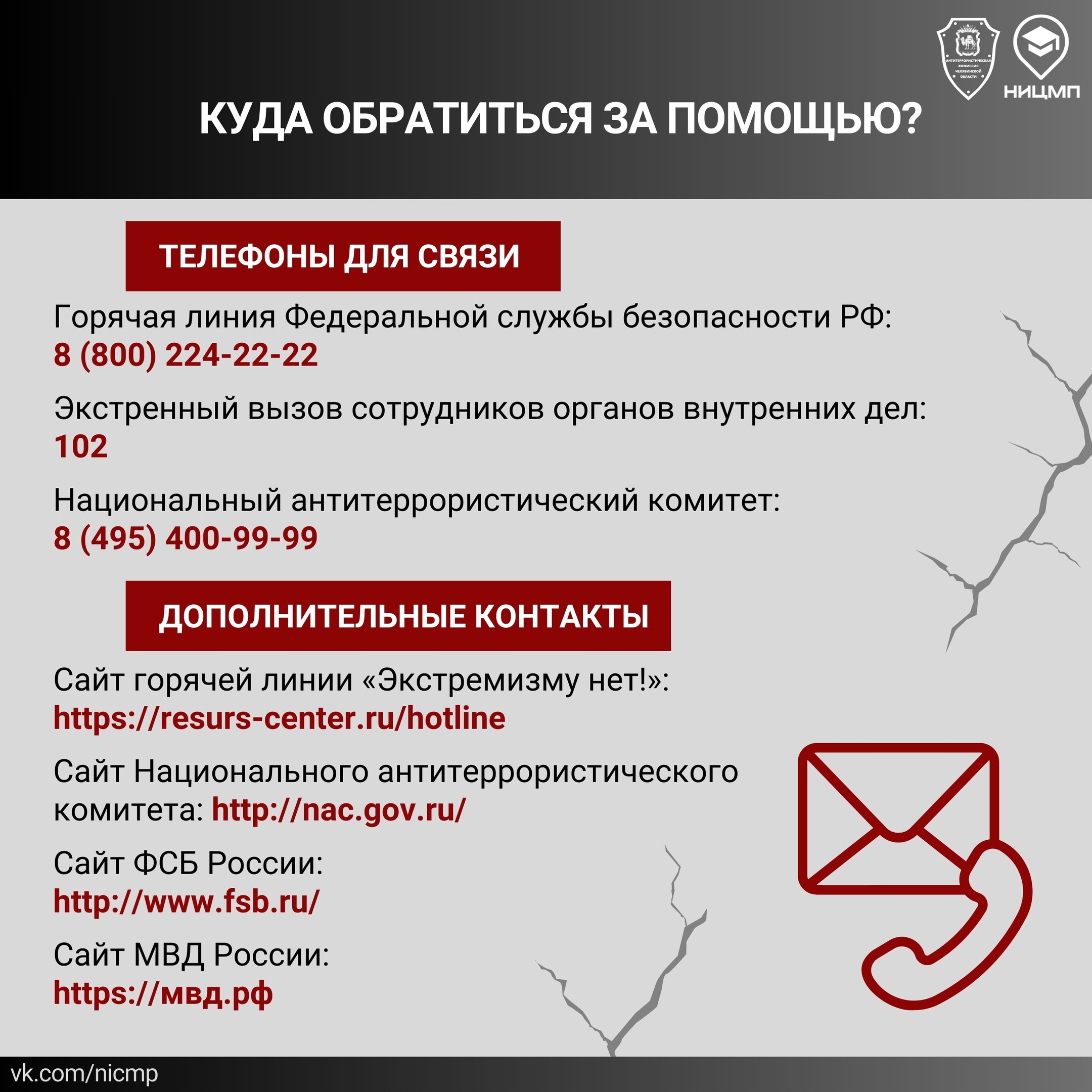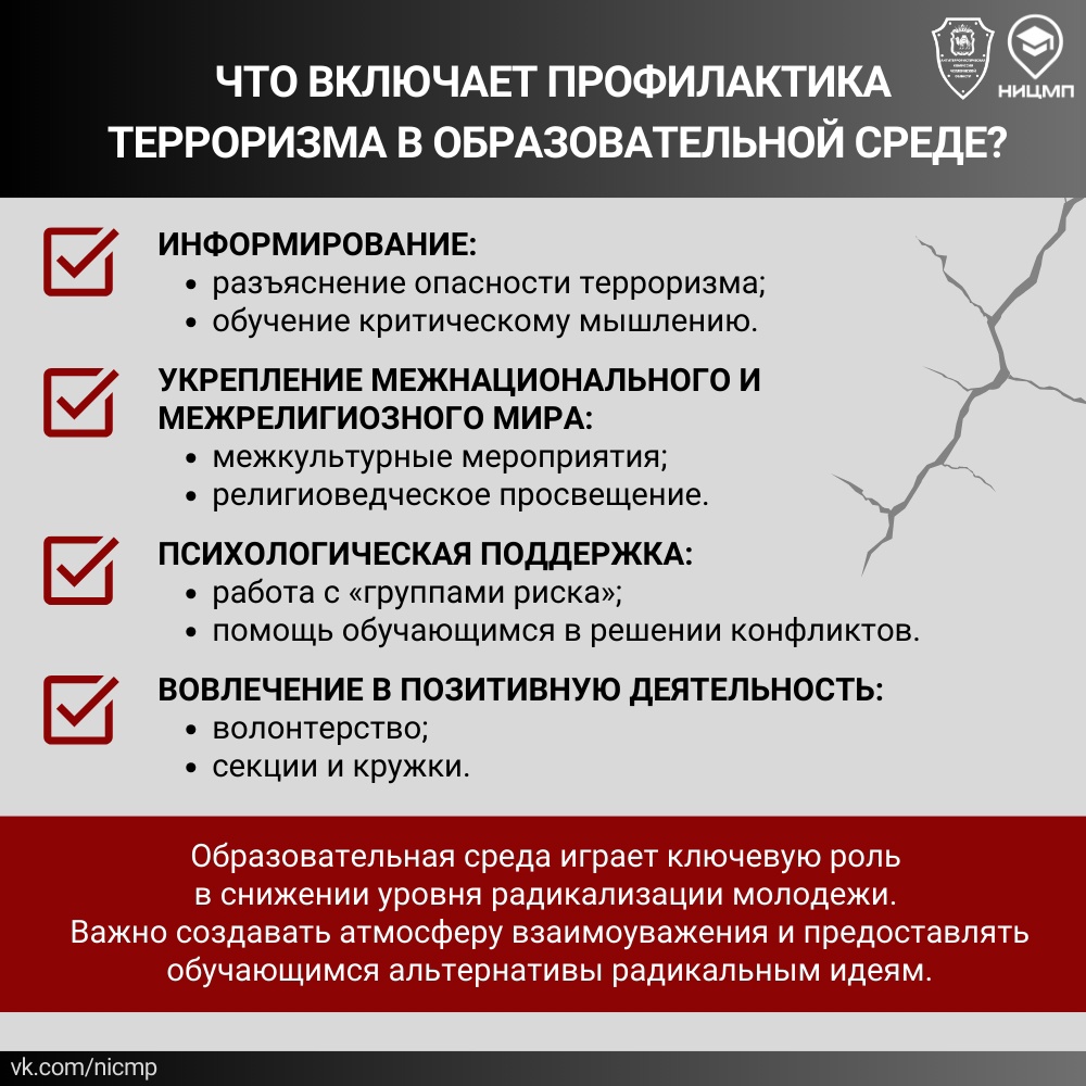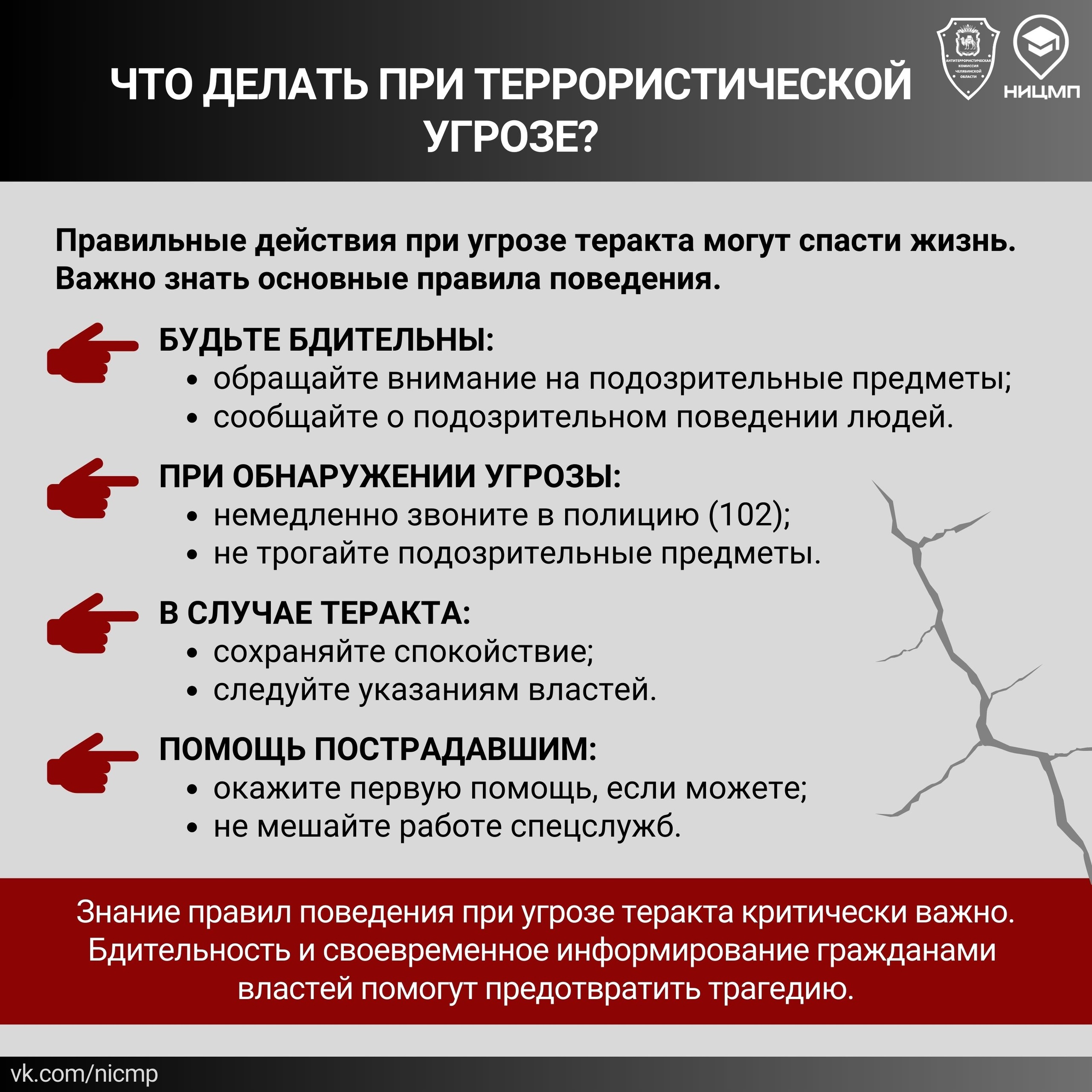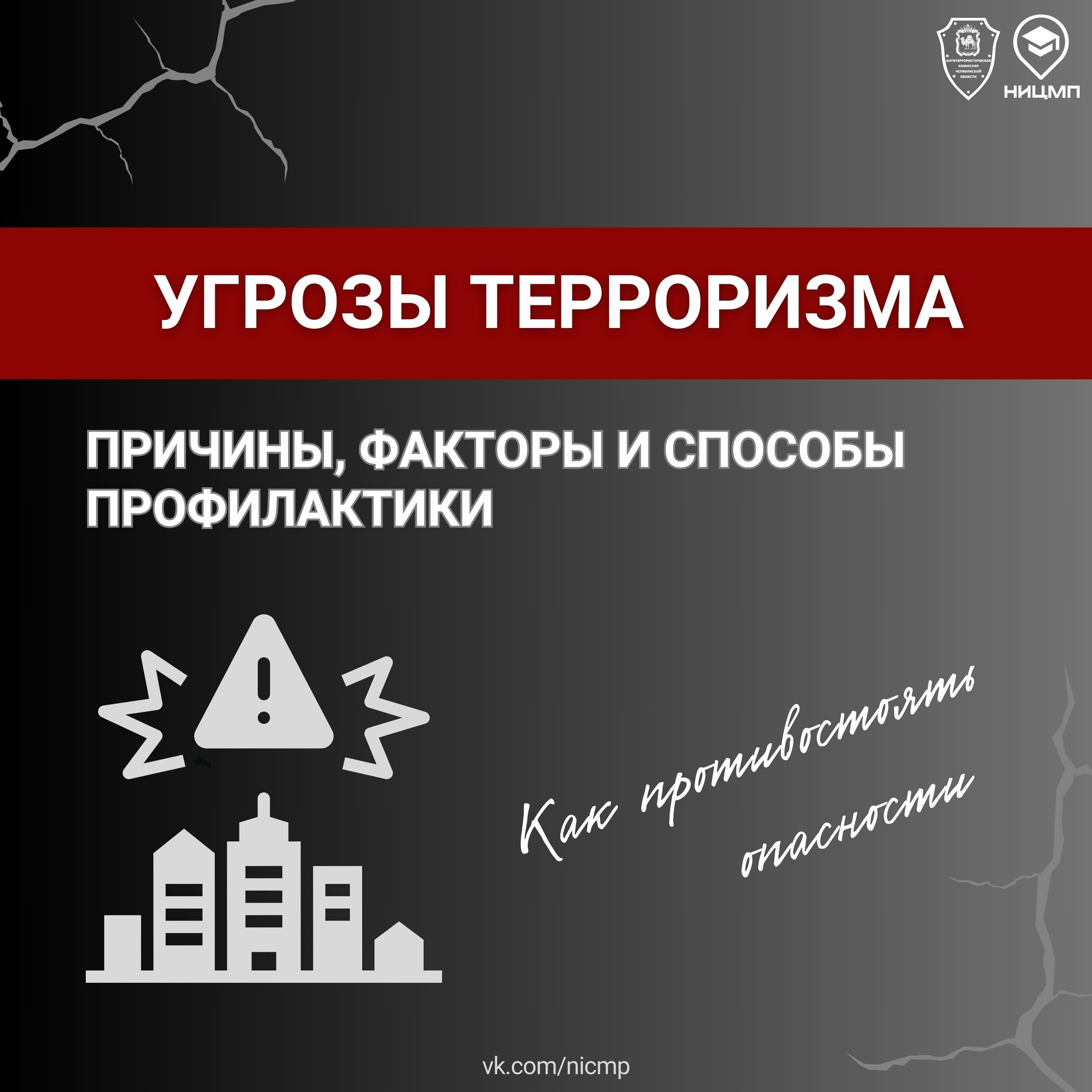 НИЦ Мониторинга и профилактики совместно с аппаратом Антитеррористической комиссии Челябинской области подготовил специальные информационные карточки. В них рассмотрены причинах роста террористических угроз, описаны тактики террористов, источники радикализации, правила поведения при угрозе теракта, а также обозначены аспекты противодействия терроризму в России.