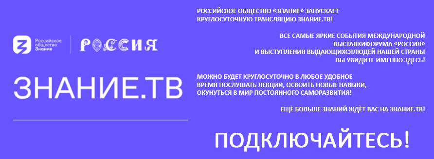 Все самые яркие события Международной выставки- форума «Россия» и выступления выдающихся людей нашей страны вы увидите именно здесь! Можно будет круглосуточно в любое удобное время послушать лекции, освоить новые навыки, окунуться в мир постоянного саморазвития! Ещѐ больше знаний ждѐт вас на Знание.ТВ!