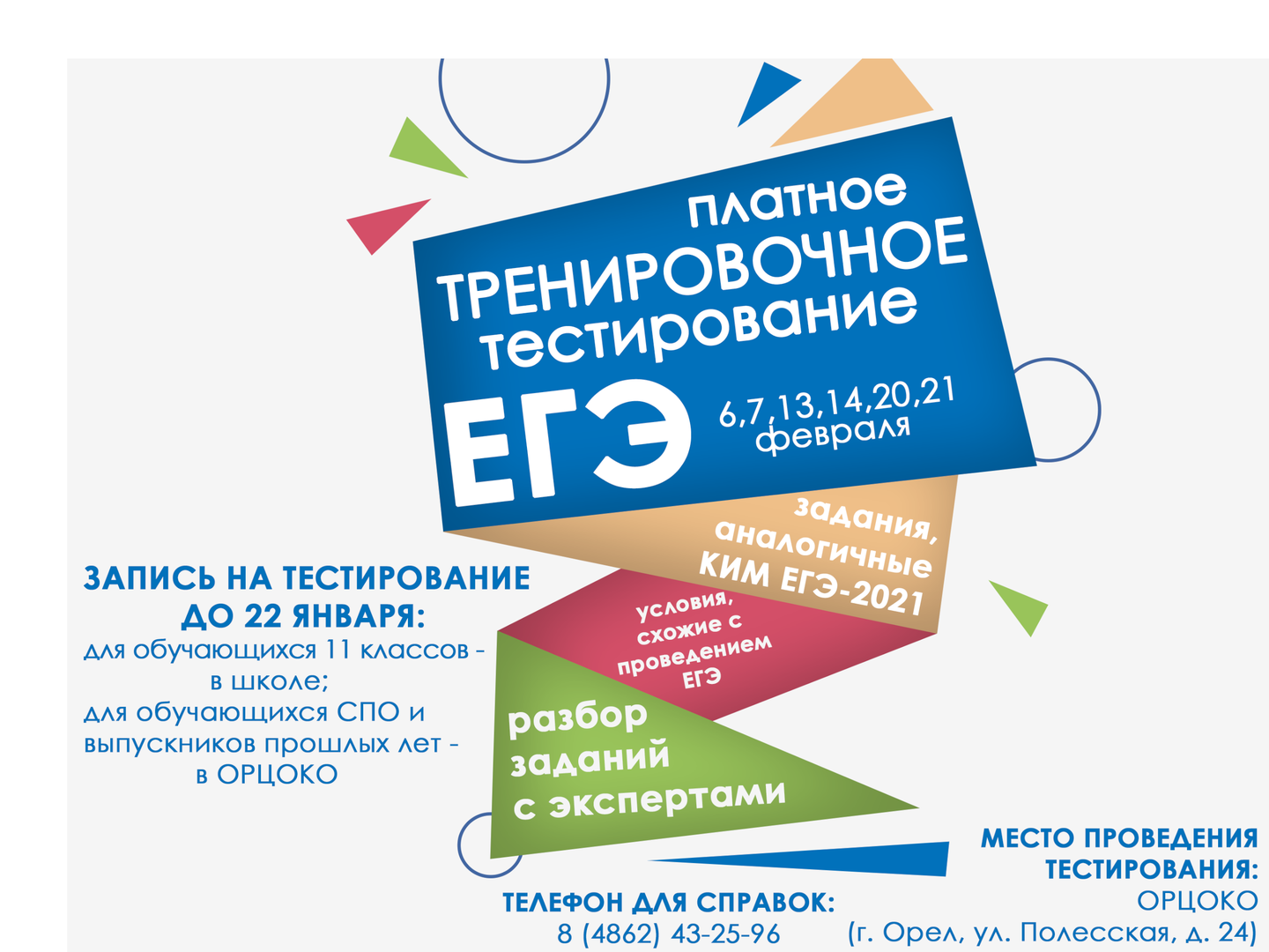 На базе Регионального центра оценки качества образования (ОРЦОКО) с 6 февраля по 21 февраля 2021 года пройдёт тренировочное тестирование для выпускников 11-х классов, обучающихся СПО и выпускников прошлых лет.