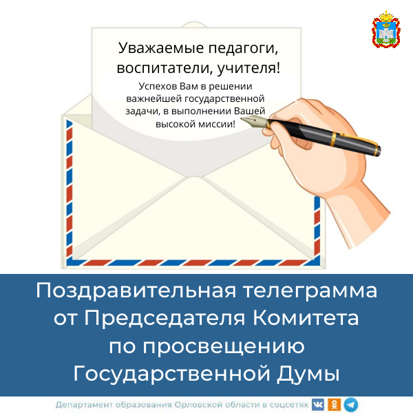 Комитет по просвещению Государственной Думы Федерального Собрания Российской Федерации восьмого созыва направляет в адрес педагогического сообщества Орловской области поздравительную телеграмму: